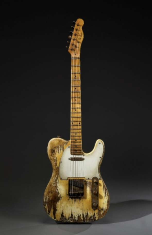 Réalisée récemment, cette guitare reprend le modèle d’une Fender Telecaster des années 1950, et revêt un aspect vintage. Vieillie volontairement et patinée, avec des parties métalliques rouillées, elle présente de nombreuses signatures et annotations, notamment à l’intérieur des parties démontables.