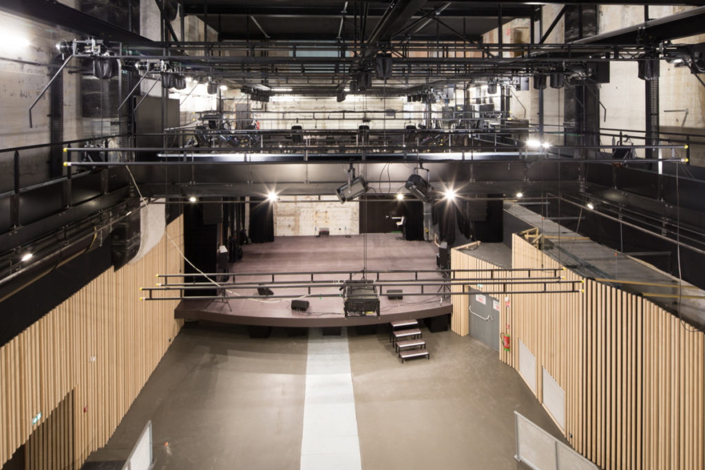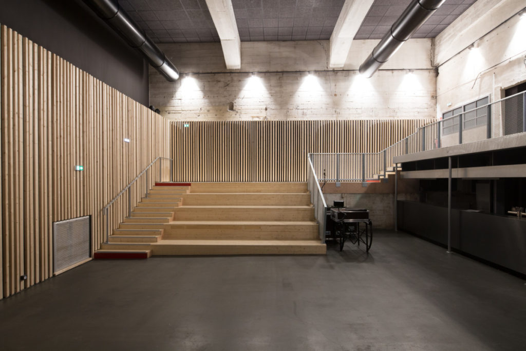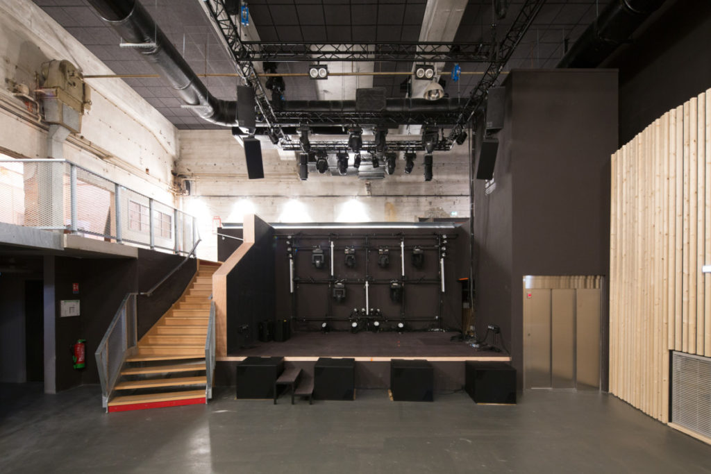Au nord, la partie « nuit » est dédiée aux salles de diffusion : une grande salle de 500 places avec une arrière scène confortable, 3 loges et un club de 120 places adapté aux résidences d’artistes.