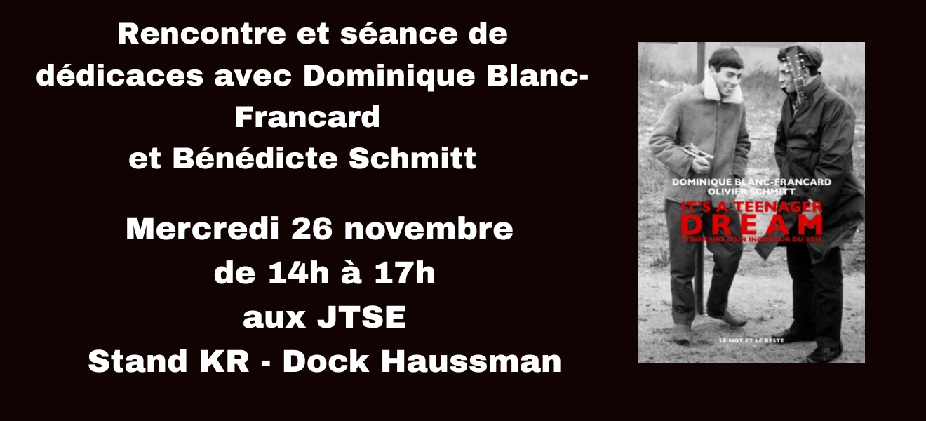 Nous vous invitons à retrouver Bénédicte Schmitt et Dominique Blanc-Francard des Labomatic Studios sur le stand KR, Dock Haussmann, lors des JTSE, le mercredi 26 novembre de 14h à 17h, pour une séance de dédicaces de la nouvelle édition de l’ouvrage It’s a Teenager Dream – Itinéraire d’un ingénieur du son, co-écrit par Dominique Blanc-Francard et Olivier Schmitt, publié chez Le Mot et le Reste.