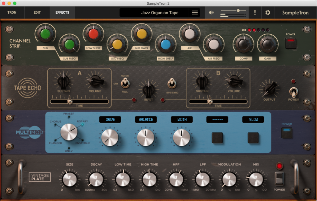 Les effets comprennent un égaliseur, un compresseur de Channel Strip, un Tape Echo, un Multimod (avec sélection de chorus, ensemble, flanger, phaser, Uni-V et Rotary Speaker) et la Vintage Plate Reverb, basée sur l’algorithme Plate développé pour AmpliTube 5 et MixBox.