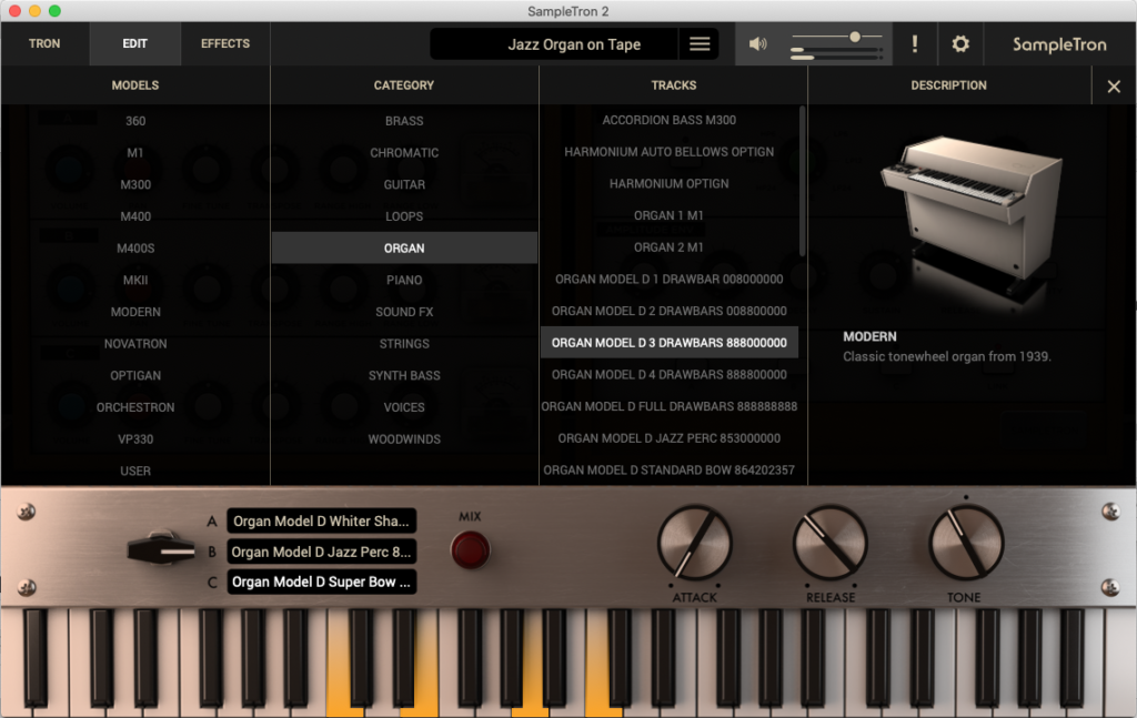 Cette collection de près de 8 Go de samples propose l’échantillonnage des vintage Mellotron® et Chamberlin à bandes. Également au programme, une collection de nouveaux sons acoustiques « non-Tron » avec processing à bande. Ceux-ci permettent aux utilisateurs de charger leurs propres échantillons et de créer des sons Tron originaux.