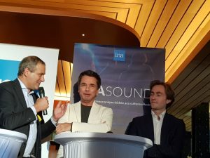 Laurent Vallet (Président-directeur général de l’INA), Jean-Michel Jarre et Mathieu Roux (Directeur Général du Palais Brongniart)