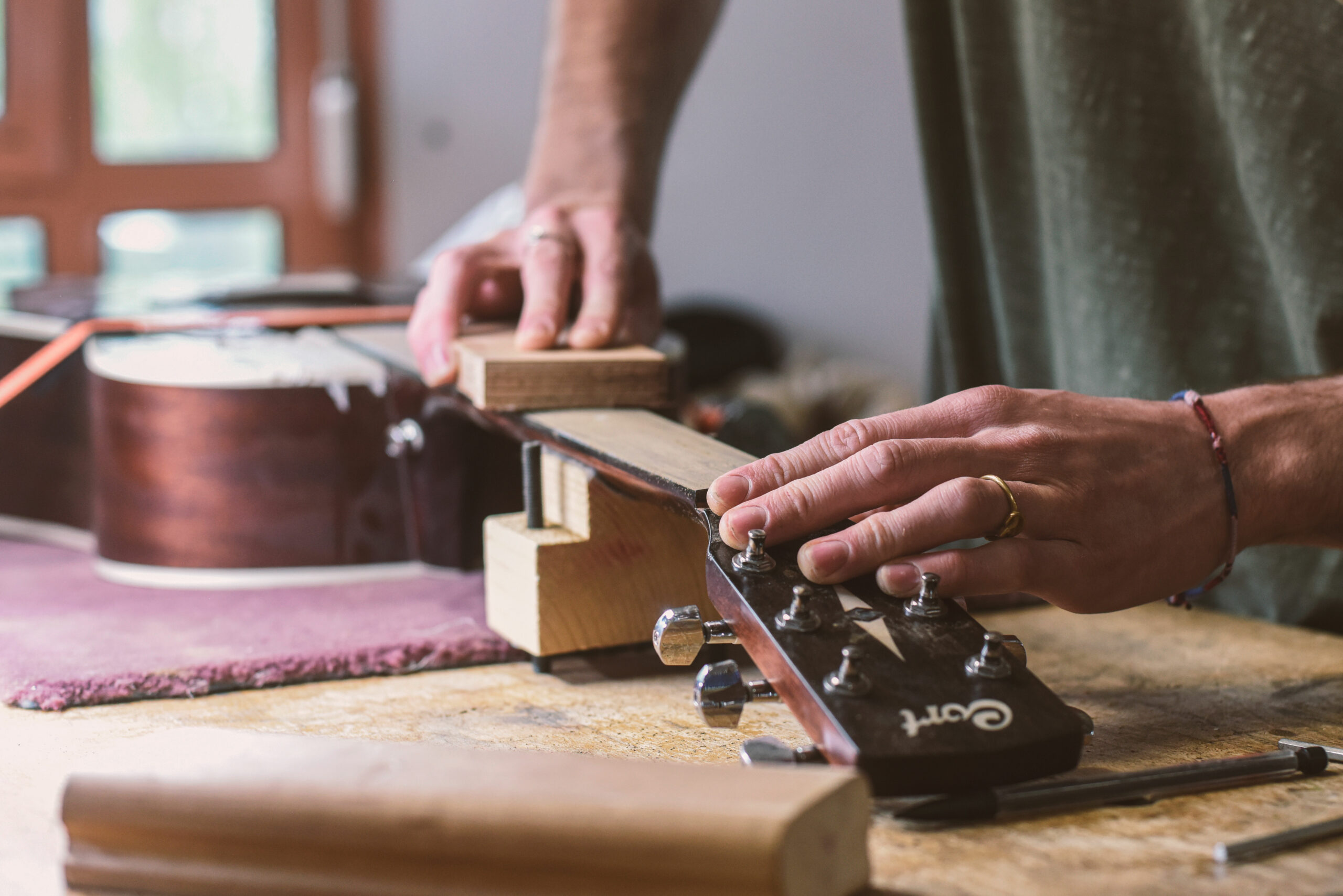 À quelques mètres de là, l’ambiance se veut moins feutrée. Les tatouages ornent les avant-bras, les t-shirts à l’effigie de groupes de metal se dessinent sous les tabliers floqués au logo de l’école… ici, on est dans le royaume de la guitare. Cet après-midi-là, les élèves travaillent sur le corps d’une guitare acoustique sous la houlette de leur professeur Antoine Schmitt, ancien élève de l’Itemm, et qui intervient essentiellement sur le C.A.P. réparateur de guitare, qui compte chaque année 12 élèves en alternance et 12 en formation continue.