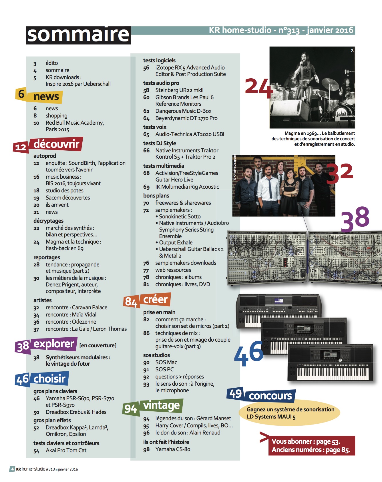 Reportages -> Magma et la technique, flash-back en 1969 ; Quelle perspective pour les synthétiseurs en 2016 ? ; SoundBirth, une application pour les musiciens ;