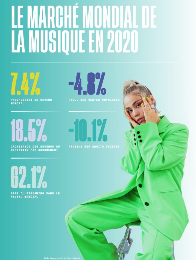 Le marché mondial de la musique enregistrée a augmenté de 7,4% en 2020, c’est la sixième année consécutive de croissance, selon l’IFPI, l’organisation qui représente l’industrie de la musique enregistrée dans le monde. Les chiffres publiés le mardi 23 mars 2021 dans le Global Music Report de l’IFPI montrent que les revenus totaux pour 2020 s’élevaient à 21,6 milliards de dollars américains.