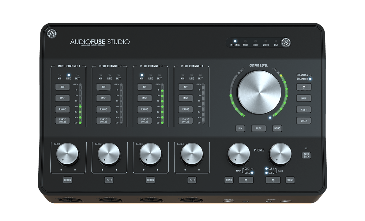 Présentée dans un châssis en métal et couvercle avec revêtement en cuir, l’élégante AudioFuse Studio est une interface 18 entrées et 20 sorties (24 bits / 192 kHz), connectée en USB-C. Elle est équipée de 4 préamplis DiscretePro micro/ligne avec points d’insert, 4 entrées ligne, 2 paires de monitoring TRS symétriques avec commutateur A/B, 2 sorties casques (sur jack 6,35 mm et mini-jack 3,5 mm), 2 sorties ligne pour le réamping, monitoring direct avec mixage interne. Elle offre aussi 8 E/S en ADAT 96 kHz, E/S MIDI, E/S en S/PDIF et entrée Word Clock. Elle est accompagnée d’une suite logicielle comprenant diverses émulations : Trid-A Pre, 1973-Pre, V-76-Pre, Mini-Filter plus l’Analog Lab Lite.