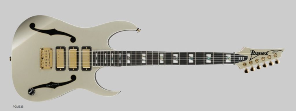 Dans la lignée des modèles PGM301, PGM500, PGM800 ou même le modèle « low cost » PGM30, l’Ibanez PGM333 30thAnniversary Signature reprend tous les codes des précédents modèles signature comme la tête renversée et les ouïes en f sur le corps. Le corps emprunté aux RG est lui aussi celui choisi pour ce modèle.