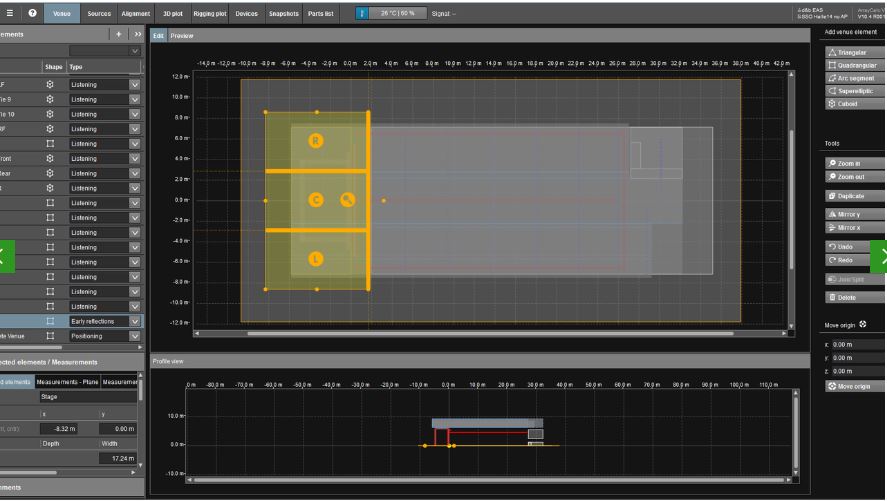 La première étape à réaliser est de définir l’environnement dans lequel on se situe. Une tâche effectuée par l’outil ArrayCalc, où l’on va dessiner à la manière d’un AutoCad ou Google Sketchup la pièce et y définir les sources sonores. Ainsi, peu importe où une personne se situe dans une salle, elle pourra bénéficier de cette écoute optimale grâce aux calculs effectués par la machine.
