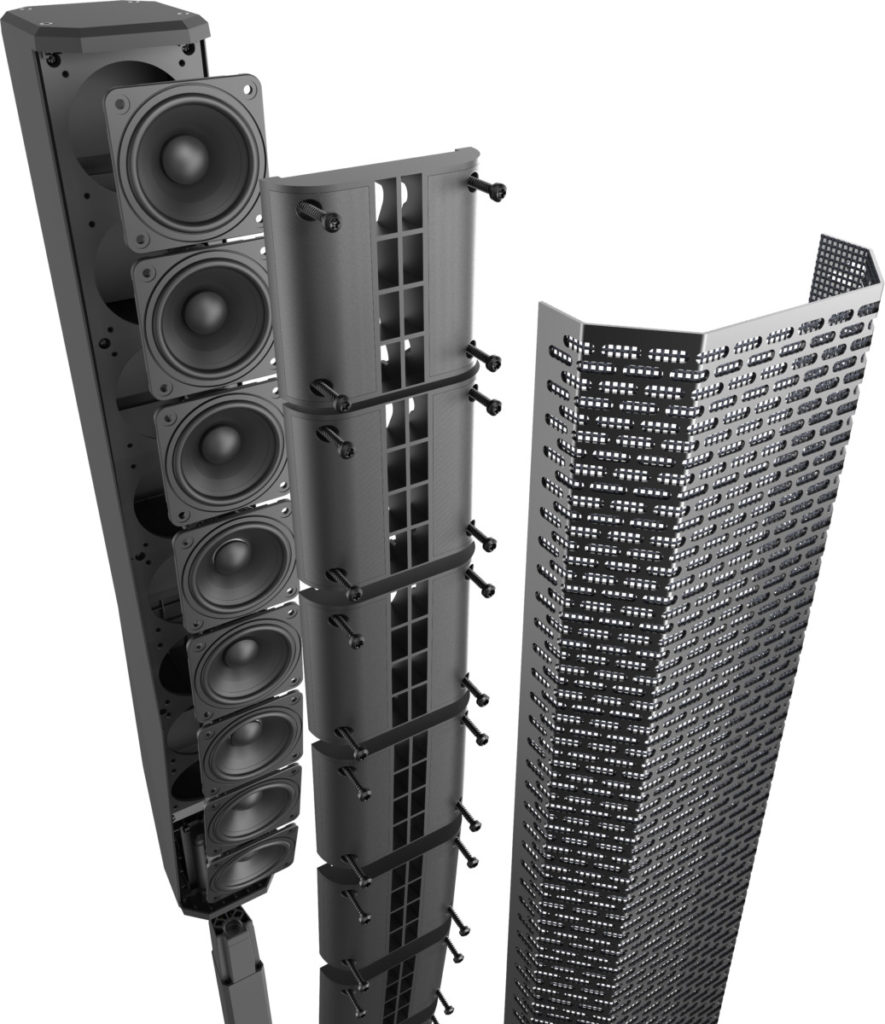 Colonne et caisson sont reliés par un pôle symétrique en aluminium avec câblage interne et verrouillage à assistance magnétique. L’ampli classe D fournit jusqu’à 1000 W de puissance. Le mixeur interne dispose de 4 entrées XLR/TRS combo micro/ligne, 1x XLR/TRS combo stéréo ligne, 1 RCA, 1 3,5 mm stéréo, 1 Hi-Z instrument plus streaming Bluetooth®. Départs auxiliaires indépendants, entrée pour pédale de commande et une gamme d’effets (30 presets, dont chorus, delay, flanger et réverb via deux canaux FX) permettent aux musiciens d’affiner leur son.