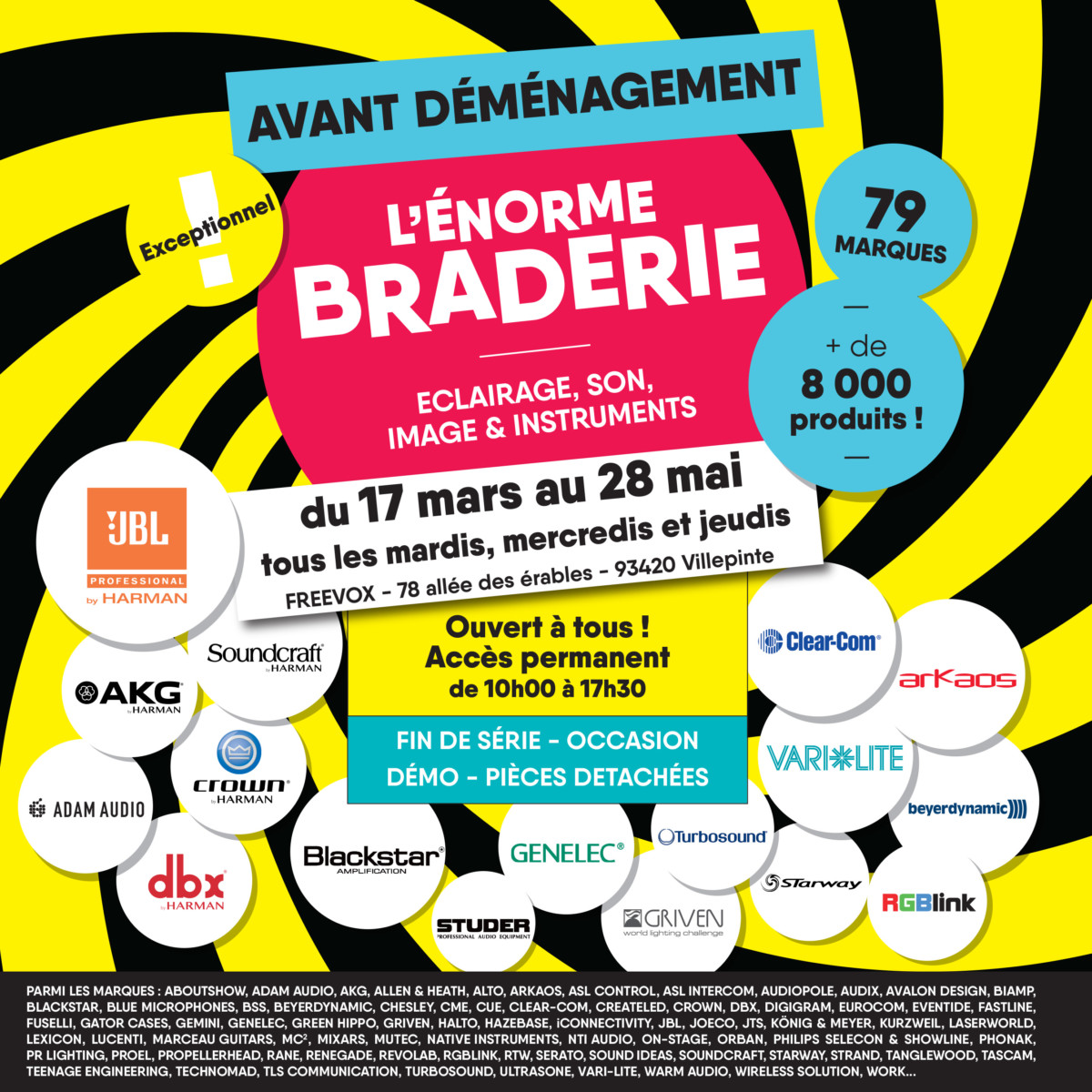 A l’occasion de leur prochain déménagement, Arbiter, Audiopole et Freevox, sociétés du Groupe CSI, organisent une vente exceptionnelle de produits professionnels de fin de série, de démonstration, d’occasion et de pièces détachées.