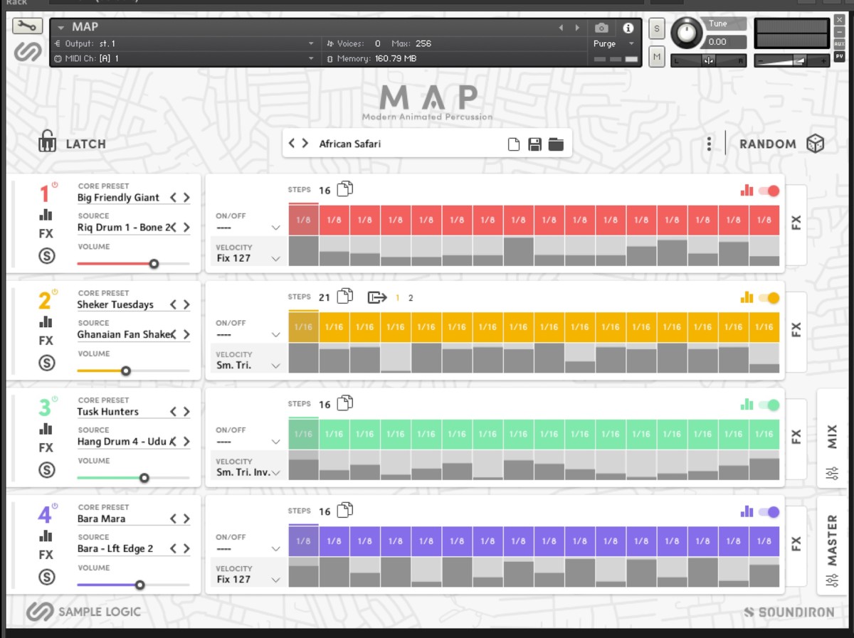 Si, avec ses 4 000 samples de percussions de toutes sortes et pratiquement 2 000 presets, MAP ne pèse qu’un peu plus de 5 Go, c’est parce qu’elle ne contient aucune boucle. La diversité et la qualité sonores des pistes percussives de MAP sont rendues possibles par son moteur audio, le « 4-core Engine », basé sur Kontakt en version complète. Ce dernier pilote jusqu’à quatre pistes indépendantes possédant chacune deux composants principaux : un Step Animator (un moteur MIDI pas à pas) et un moteur d’effets, le Dynamic FX Engine. La plupart des paramètres sont en outre modifiables en temps réel par l’utilisateur, pour un rendu très organique et vivant.