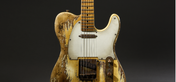 Réalisée récemment, cette guitare reprend le modèle d’une Fender Telecaster des années 1950, et revêt un aspect vintage. Vieillie volontairement et patinée, avec des parties métalliques rouillées, elle présente de nombreuses signatures et annotations, notamment à l’intérieur des parties démontables.