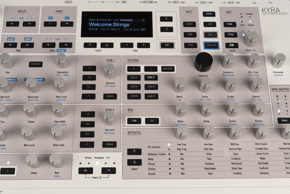 Le Kyra possède deux waves oscillateurs pourvus de 4096 formes d’ondes ainsi que différentes simulations de VCO analogique (Pulse, Saw, Noise, etc.), une section de filtres Ladder LP/BP/HP, trois EG, trois LFO avec 128 pentes chacun.Ce synthé dispose aussi d’un arpégiateur avec 128 patterns en presets. L’interface embarque un écran OLED, ainsi que des connexions en USB 2.0, MIDI In/Out/Thru et quatre sorties stéréos analogiques symétrisées.